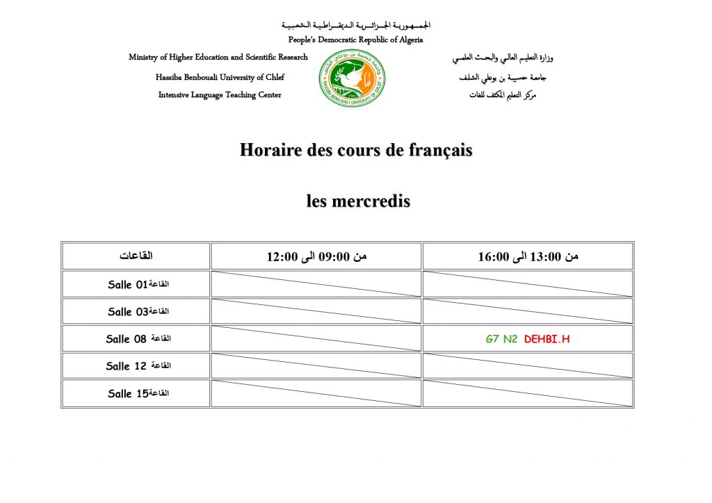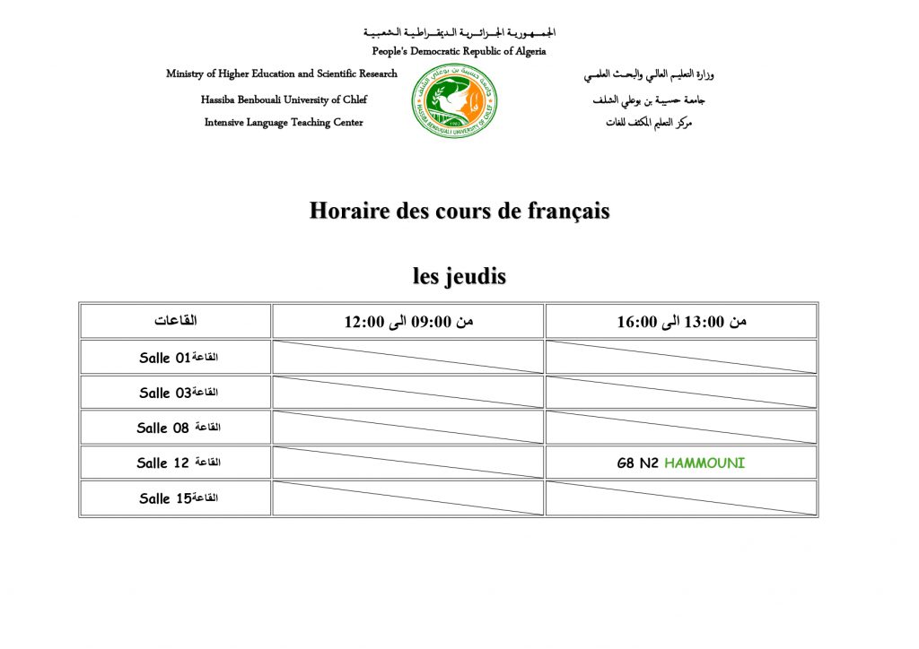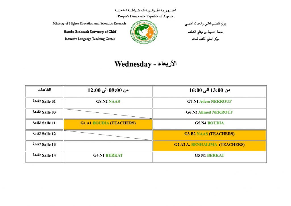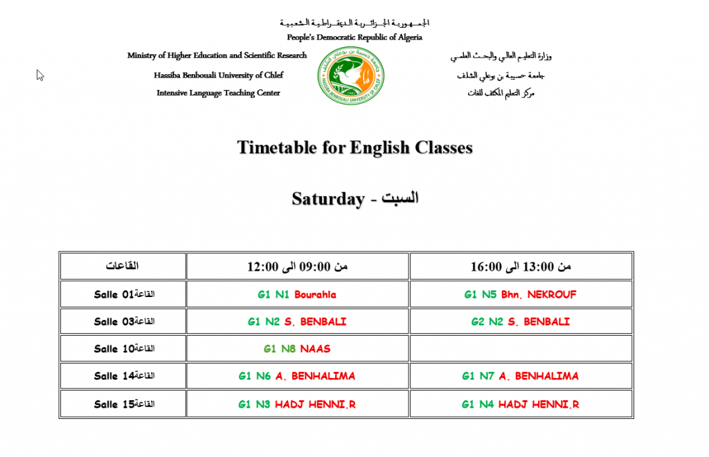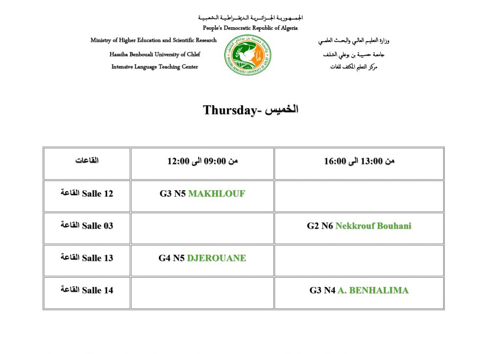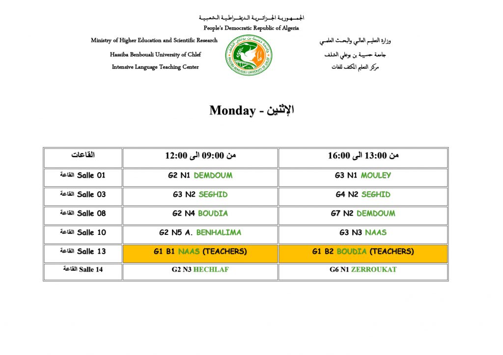 تعلن إدارة مركز التعليم المكثف للغات (CEIL) بجامعة حسيبة بن بوعلي بالشلف كافة المتعلمين المسجلين للموسم الجامعي 2025-2026، عن نشر قوائم الأفواج النهائية والجداول الزمنية الأسبوعية.